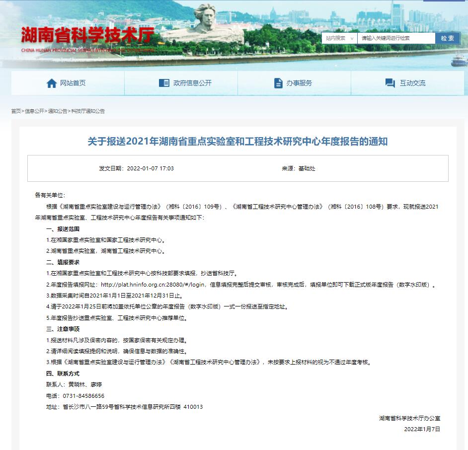 根据湖南省科技厅《关于报送2021年湖南省重点实验室和工程技术研究中心年度报告的通知》,我校各省重点实验室和工程技术研究中心需报送2021年年度报告,现就具体工作事项通知如下: